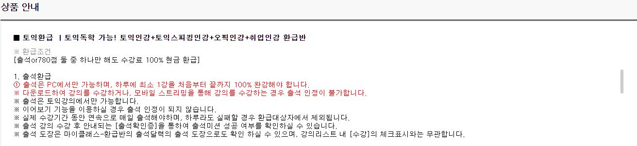 구매 시에 뜨는 상품 안내를 보시면, 기본은 194,220원 환급받게 되어있어요. 이건 출석을 매일매일하거나, 780점만 달성하면 환급받는 금액이에요. 다른 환급 조건들은 밑의 사진을 참고해주세요!