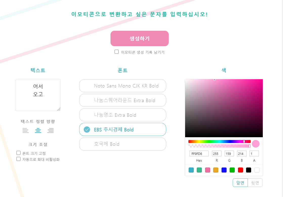 텍스트를 입력한 후, 폰트와 폰트의 색상을 지정해서 이모티콘을 간단하게 만들 수 있습니다.