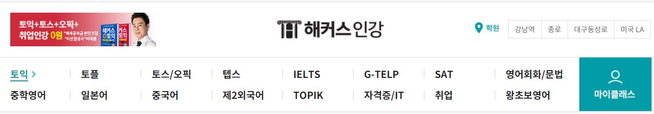 1. 처음에 해커스 인강 사이트(https://champ.hackers.com/)에 들어가게 되면, 상단에 <마이페이지>가 뜹니다.