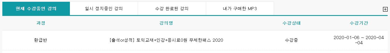 2. <마이페이지>를 누르고 <현재 수강중인 강의>에서 <환급반/[출석or성적] 토익교재+인강+응시료0원 무제한패스 2020>을 누릅니다.