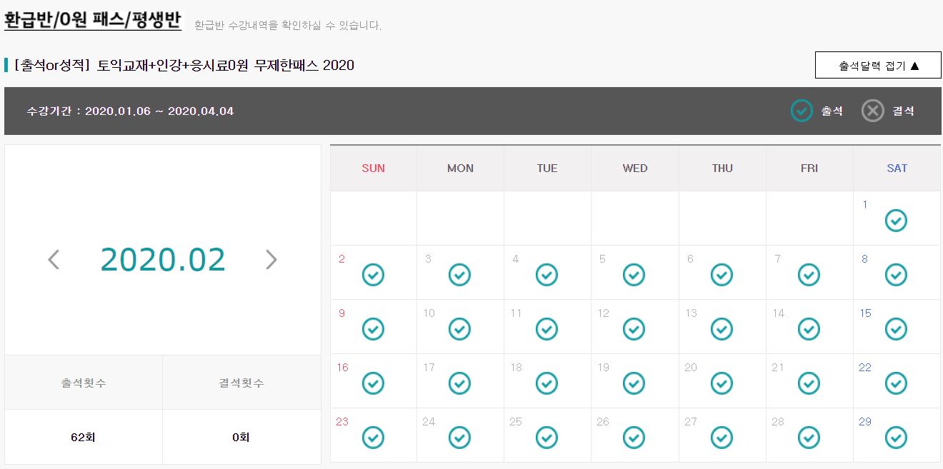 3. 그러면 이렇게 환급반/0원 패스/평생반의 출석표가 뜨게 됩니다. 이 출석표에 따라서 환급받을 수 있으니, 강의를 다 수강하신 뒤 체크하는 걸 추천합니다. 저는 강의가 끝난 뒤 나오는 팝업창을 눌러도 불안해서 항상 강의 끝난 뒤 출석표를 확인합니다. 하루 결석하면 환급을 못 받으니까요...