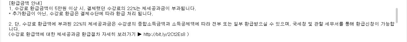 제세공과금은 본인부담입니다. 따라서 홈페이지에는 수강료 100% 환급이라고 되어있지만, 100%를 다 돌려받지는 못하는거죠!(성적에 따라 더 받는 것도 가능하긴 합니다 :D)