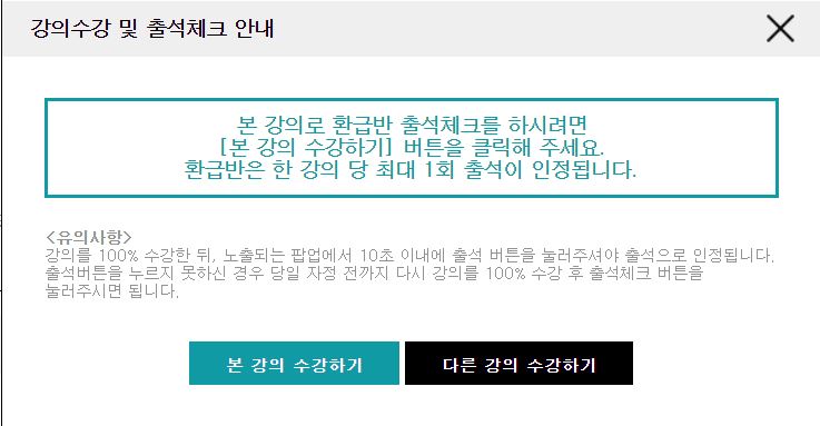 신청하신 강의 중 아무거나 누르면 이런 창이 뜹니다. 이 때, '본 강의 수강하기'를 누르시면 이 강의로 출석을 하게 되는 겁니다.