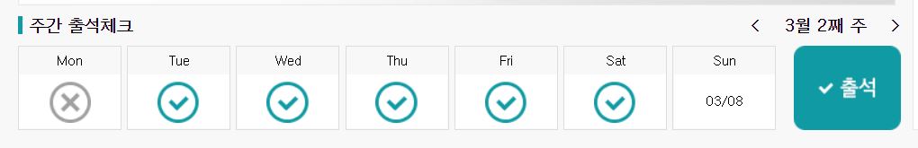 +환급반 출석표 외에 마이페이지 밑에 보면 나오는 주간 출석체크표가 있는데, 일주일 출석 완료 시 500포인트를 받을 수 있습니다. 저는 마이페이지에 들어가서 주간출석체크를 먼저 하고, 환급반 강의 출석을 해요 :) 어차피 들어가는 거 500 포인트도 받고가면 좋지 않을까하면서요.