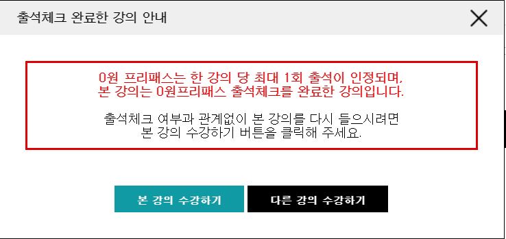 이미 이 강의로 출석체크를 하신 상태라면, 이런 창이 뜹니다. 강의 1개당 1번의 출석체크를 할 수 있습니다.