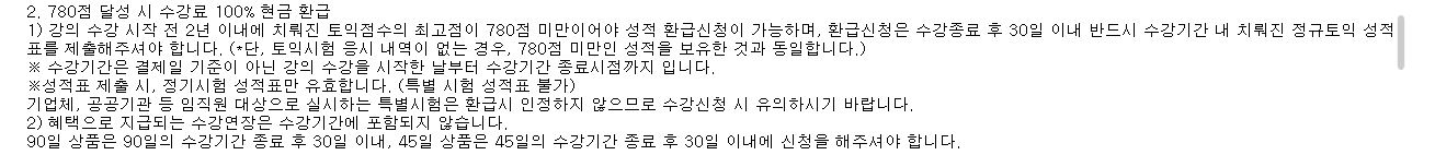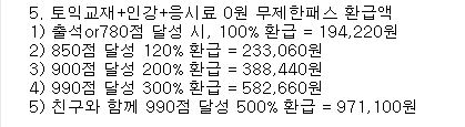 구매 시에 뜨는 상품 안내를 보시면, 기본은 194,220원 환급받게 되어있어요. 이건 출석을 매일매일하거나, 780점만 달성하면 환급받는 금액이에요. 다른 환급 조건들은 밑의 사진을 참고해주세요!